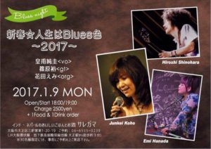 10月 19 2016 2017.1.9(mon) 新春☆人生はBlues色〜2017〜 Author: kohojunkei 場所:サレガマ(大阪・大正) 出演:皇甫純圭(vo) 篠原裕(g) 花田えみ(or) 開場:18:00 開演:19:00 料金:2,500yen(1drink 1food別) 30名様限定(要予約)のライブです。 サレガマ 大阪市大正区三軒家東1-20-19 大正AVALON 1F 06-6555-0239 Tweet Post navigation Previous Post: 2016.12.29(thu) SOUL & BLUES NIGHT Next Post: 2017.2.1(wed) Harlem Gung with 皇甫純圭